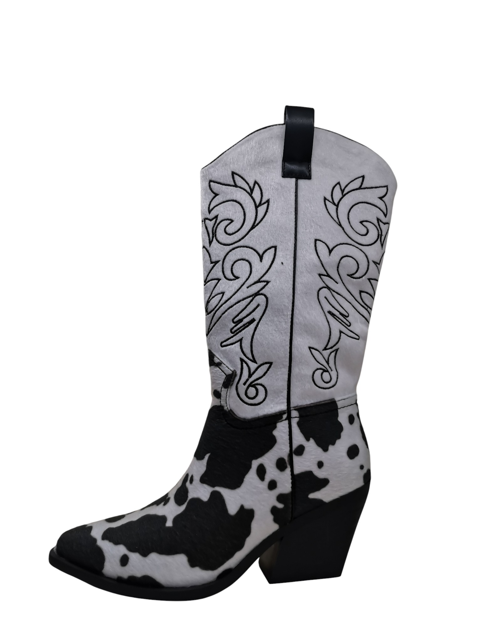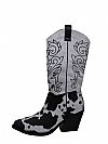 Εξωτερικά οικολογικό ύφασμα σε λευκές και μαύρες αποχρώσεις με ιδιαίτερες μαύρες λεπτομέρειες τύπου καουμπόικο, στην μέσα πλευρά υπάρχει φερουάρ, ενώ εσωτερικά υπάρχει γούνινη επένδυση ,η σόλα & το τακούνι είναι σε μαύρη απόχρωση.