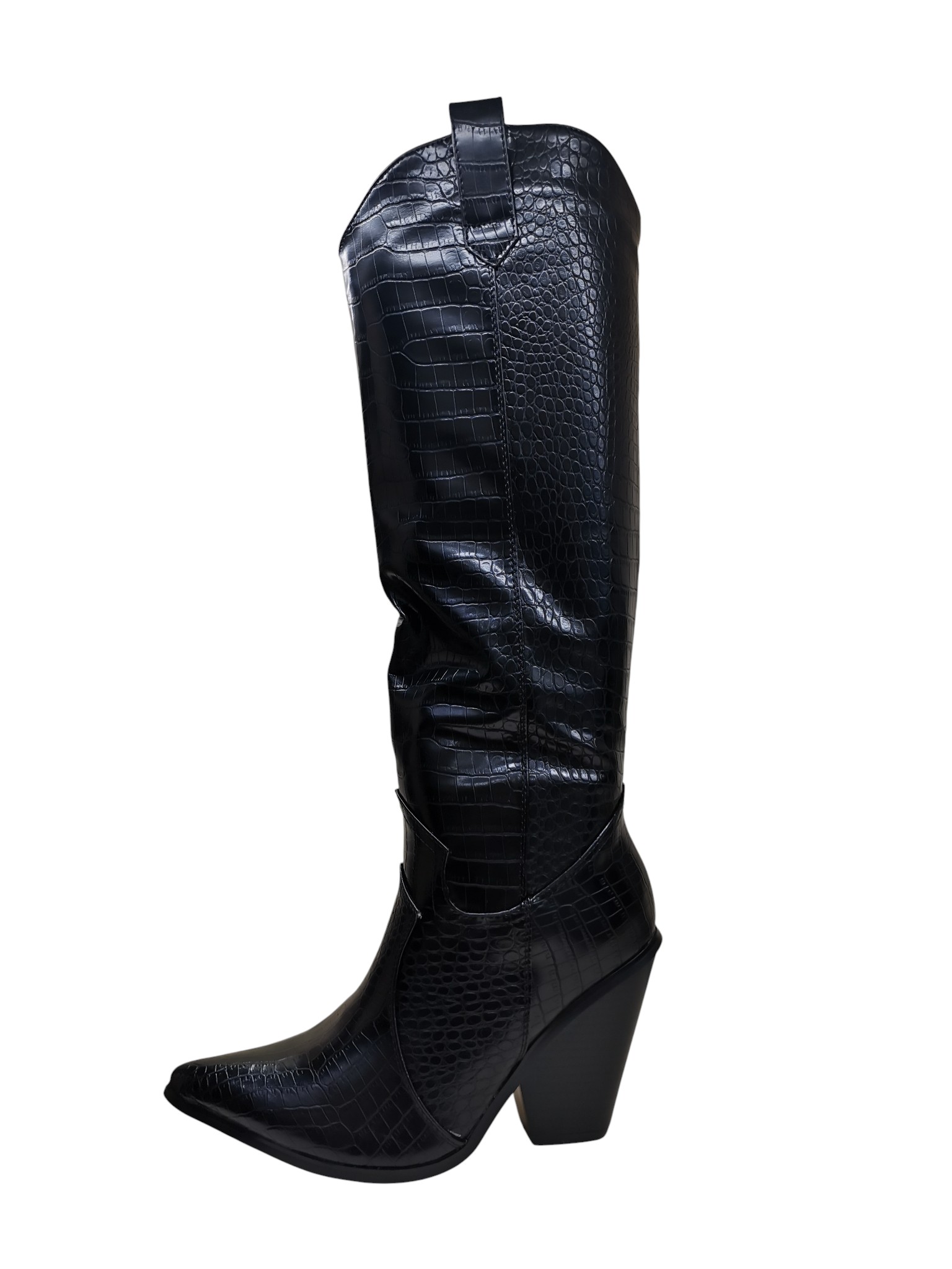 Εξωτερικά οικολογικό δέρμα κροκό λουστρίνι με ιδιαίτερες λεπτομέρειες τύπου καουμπόικο, από την μέσα πλευρά της μπότας υπάρχει φερμουάρ, εσωτερικά υπάρχει γούνινη επένδυση ,η σόλα & το τακούνι είναι σε μαύρο.