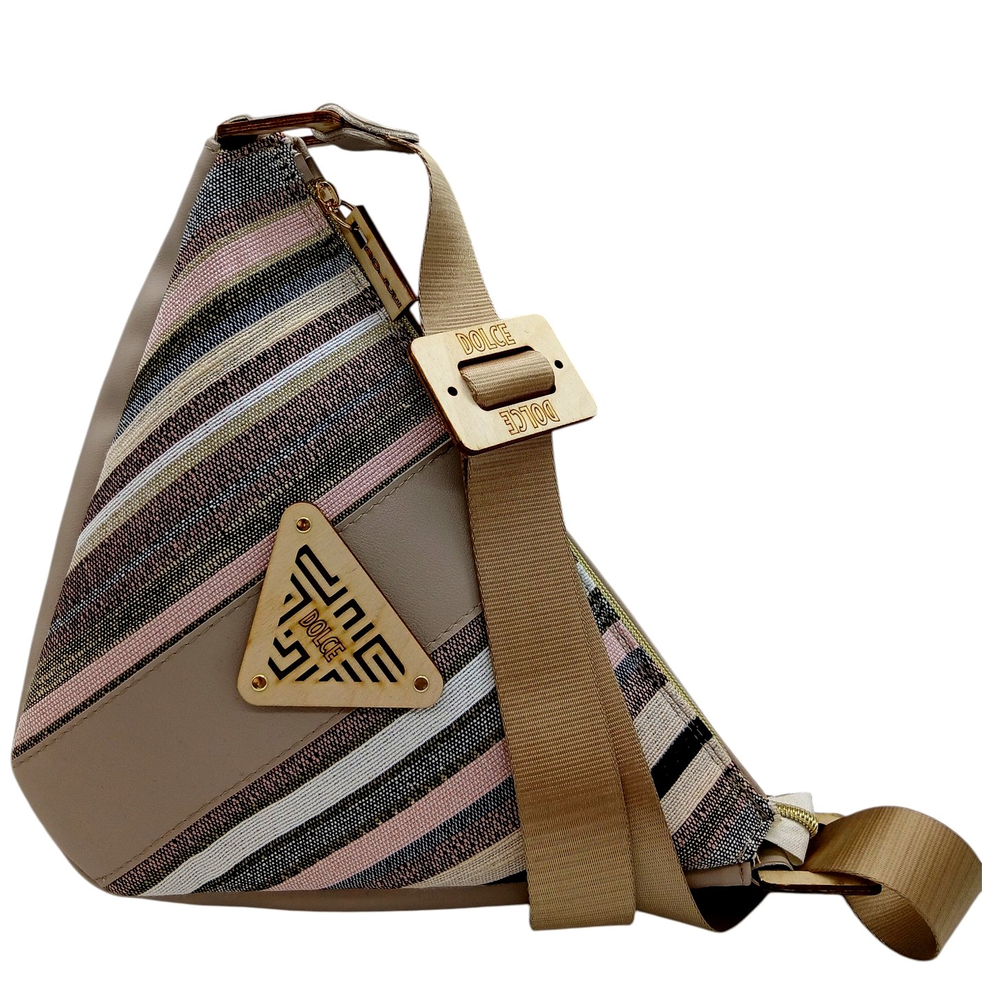 Κομψή και πρακτική γυναικεία τσάντα σε τριγωνικό σχήμα, σχεδιασμένη για άνεση και λειτουργικότητα. Διαθέτει έναν λουρί με δυνατότητα αυξομείωσης, ώστε να φοριέται εύκολα στον ώμο ή χιαστί, προσαρμοζόμενη στις ανάγκες σας.